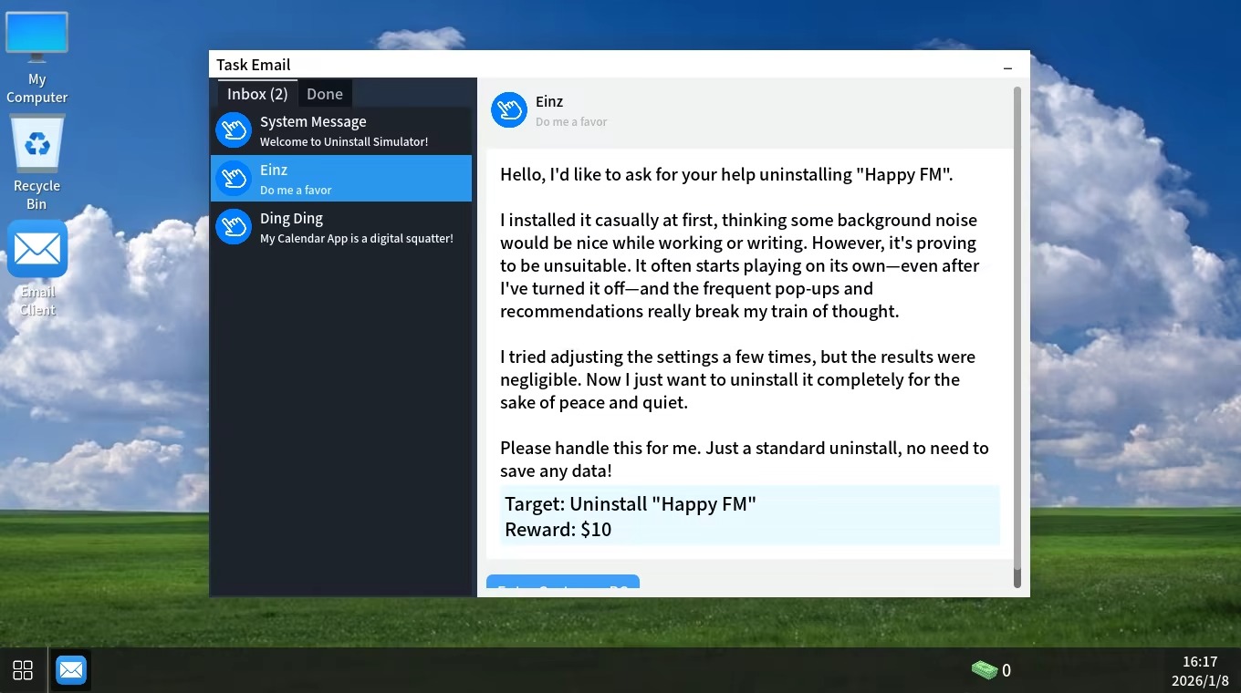 You will receive commissions via the TaskMail system. From harmless complaints like "My desktop icons are gone" to time-critical ransomware crises, every order is a fresh challenge.